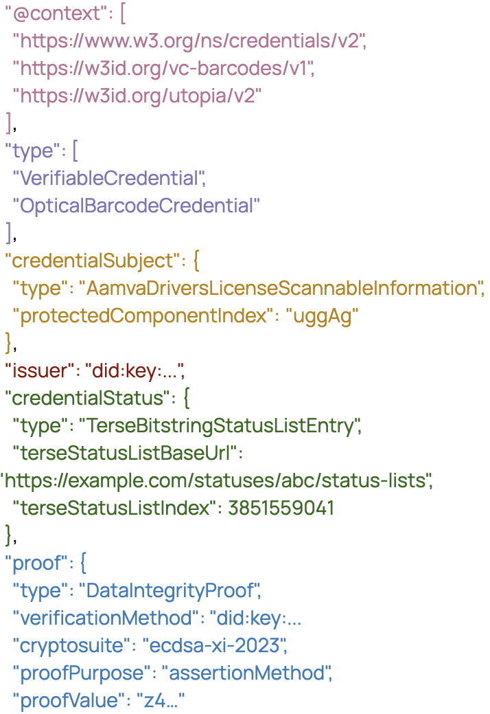 "type": ["VerifiableCredential", "OpticalBarcodeCredential"]